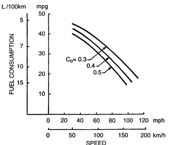 Fuel Economy : A direct consequence of increased power requirements is a reduction in fuel economy. For instance, reducing the coefficient of aerodynamic resistance (C\(_{D}\)) from 0.5 to 0.3 for a midsize passenger car can improve fuel economy by approximately 23% at a steady speed of 96 km/h (60 mph).