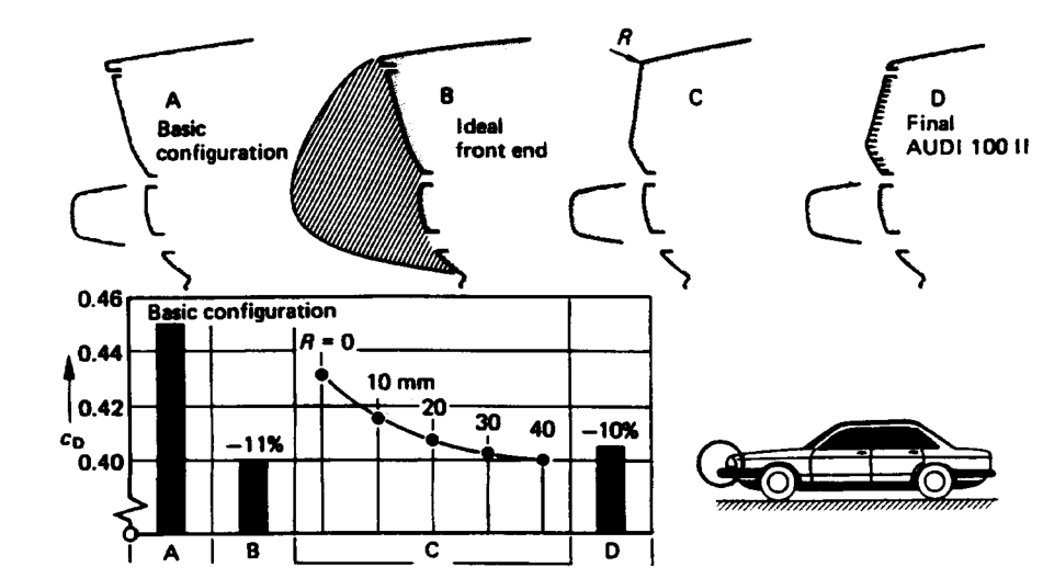 - Forebody and Afterbody Design : The shapes of both the front (forebody) and rear (afterbody) of a passenger car have a significant effect on the aerodynamic resistance coefficient. Designs like the 1934 Chrysler Airflow pioneered the use of aerodynamics and “cab-forward” design to achieve a more efficient form.