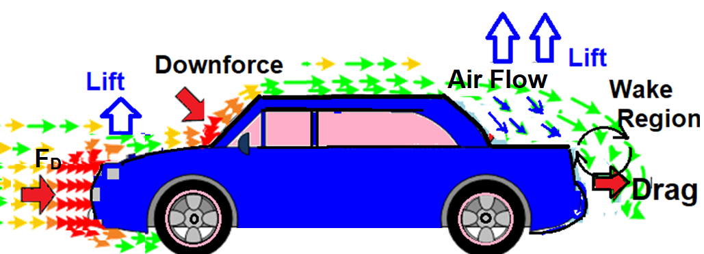 Designers use wind tunnel testing and computational fluid dynamics (CFD) to refine shapes, optimize airflow, and integrate features like spoilers, diffusers, and underbody panels. Figure 1.7 shows the effects of aerodynamic forces on a moving vehicle.