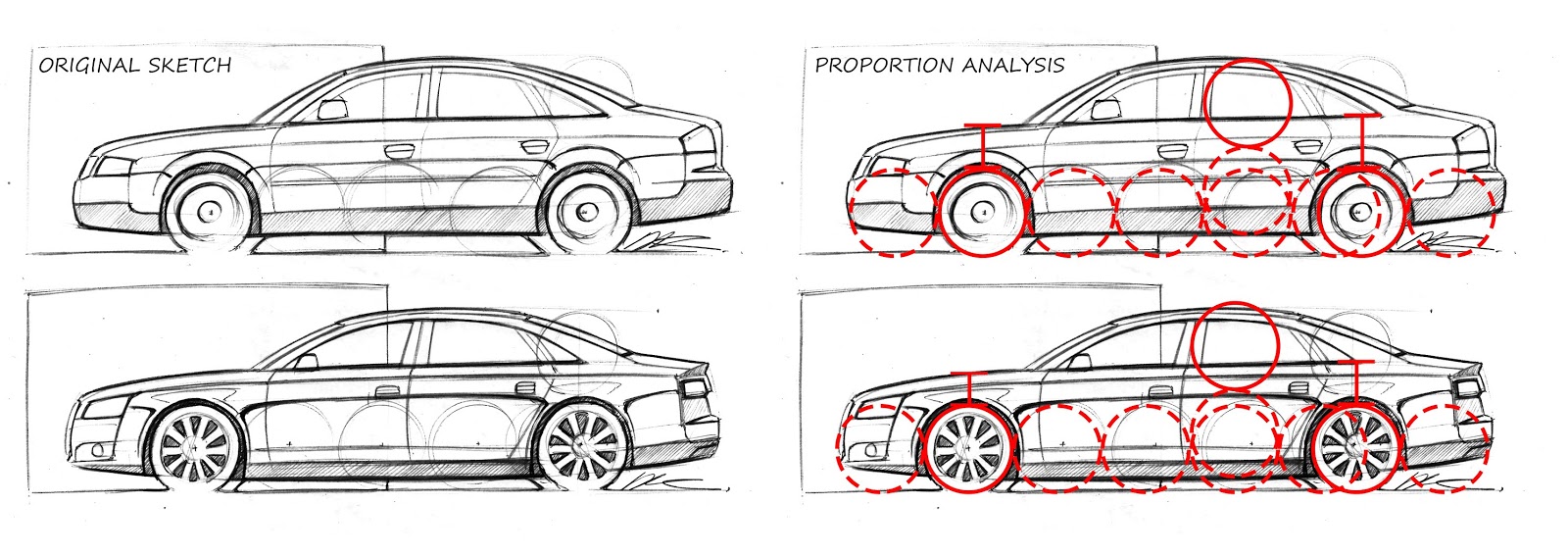 Evaluate the relationship between design proportions, surface development, and consumer perception in automotive styling.