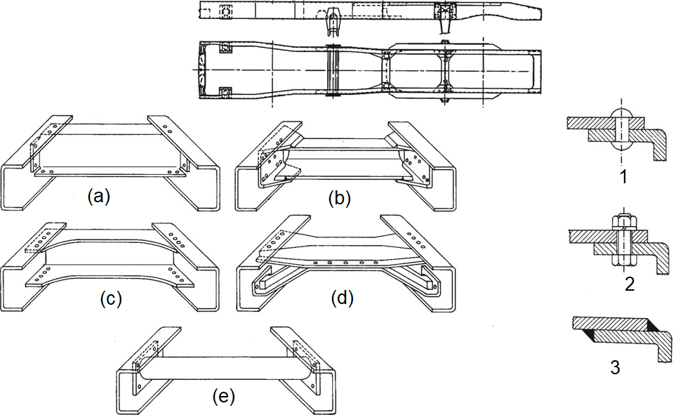 The connection methods between side and cross members are critical for structural integrity, with mechanical fasteners like rivets or bolts being preferred when disassembly for repairs is necessary, while arc welding is typically limited to smaller components due to concerns about heat-induced deformations and residual stresses that cannot be practically relieved through heat treatment given the large dimensions of industrial vehicle frames, and these joining considerations directly impact the frame’s load transfer capabilities and overall structural performance under operational conditions.