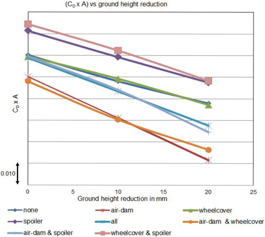 - Ground Clearance : The distance between the vehicle and the ground affects aerodynamic resistance. Figure 1.4 suggests that reducing a vehicle’s ground clearance can lead to a reduction in aerodynamic drag, and this effect is enhanced when combined with various aerodynamic modifications such as spoilers, air-dams, and wheel-covers. The “all” configuration, which combines these elements, provides the most favorable aerodynamic performance in terms of reduced drag as ground height is decreased.