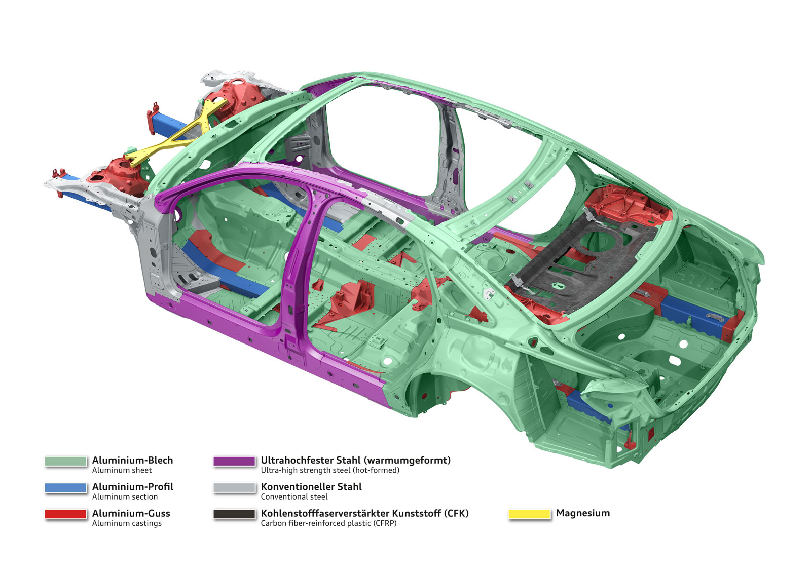 Audi A8 multi-material space frame structure showing material distribution and key components (Image: Audi AG)