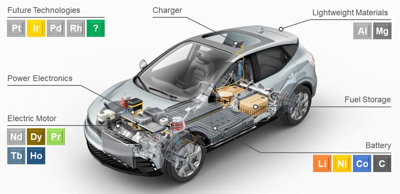 | Rare Earth Elements | Neodymium (Nd), Dysprosium (Dy), Praseodymium (Pr), Terbium (Tb) | Permanent magnets in motors, battery additives, sensors and electronics |