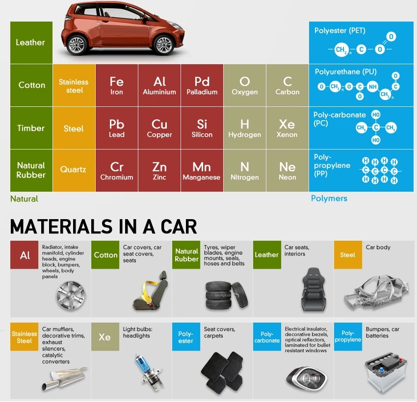 | Metals & Alloys | Steel, Aluminum (Al), Copper (Cu), Magnesium (Mg), Zinc (Zn), Lead (Pb), Nickel (Ni), Tin (Sn), Cobalt (Co), Tungsten, Molybdenum (Mo) | Body structures (steel, aluminum), wiring (copper), battery components (nickel, cobalt), lightweight components (magnesium) |