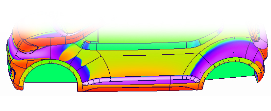 Class-A surface evaluation showing curvature analysis and highlight line quality.